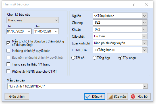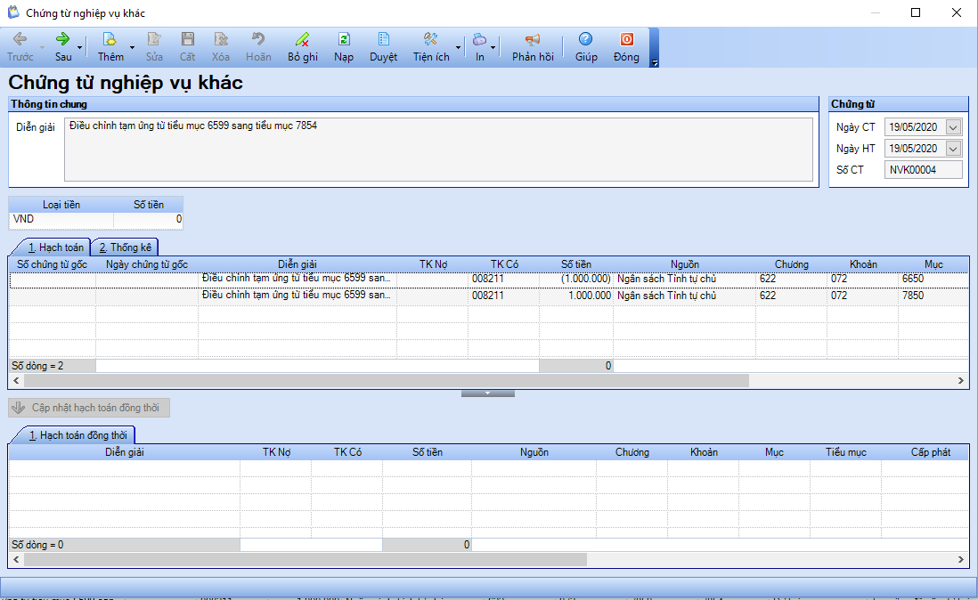 Cách 1: Hạch toán trên phiếu Điều chỉnh kinh phí