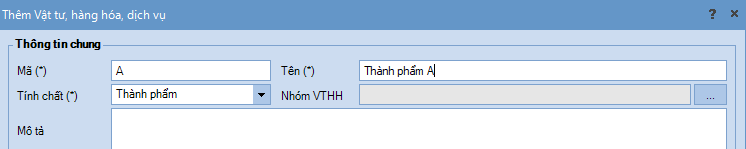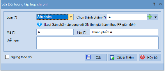 + Tạo mã Đối tượng tập hợp chi phí (ĐT THCP) cho thành phẩm A